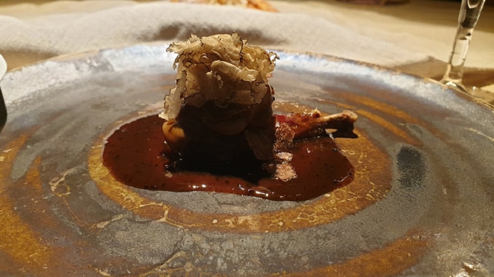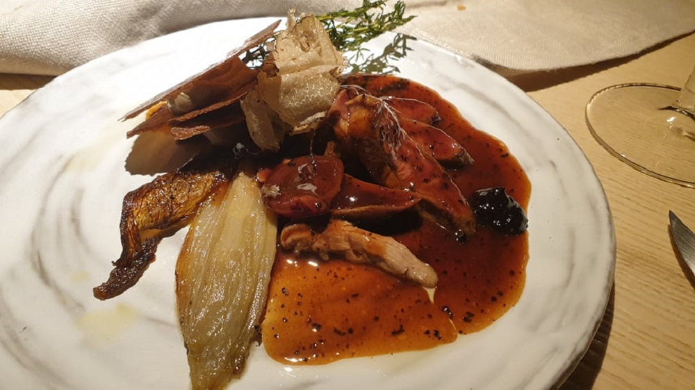 Piccione in doppio servizi0 (con spremuta di ciliegie e wafer di fegatini, la coscia con il tartufo) – Le Calandre, Sarmeola di Rubano