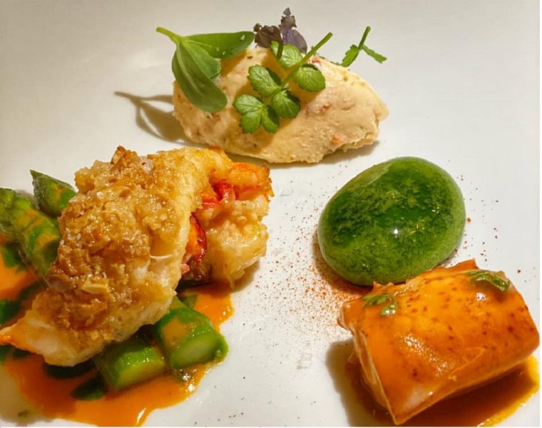 Astice gratinato alle arachidi, asparagi al sesamo e pesto di basilico – Enoteca Pinchiorri, Firenze.