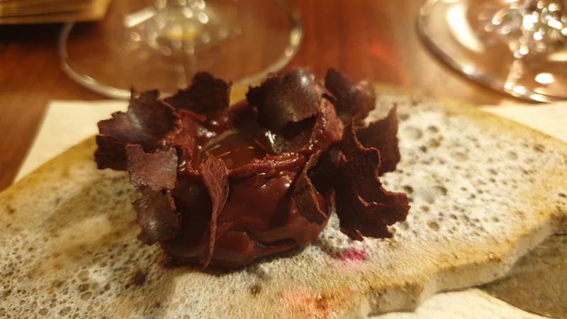 L’occasione è stata una cena all’AlpiNN, un rifugio a Plan de Corones, nato dalla sinergia tra Norbert Niederkofler e Paolo Ferretti, poprio tra Norbert e Virgilio Martinez agli inizi di gennaio. “Adesso proverete il cacao come non l’avete mai provato! Il cacao è un frutto e noi peruviani così lo trattiamo, uscendo fuori dal paradigma che gli europei hanno imposto”. Aveva ragione. Un vero e proprio viaggio nel mondo del cacao, intenso, profondo, legato indissolubilmente alla propria terra d’origine. Una serie di assaggi onirici che raccontano la lunga storia del popolo peruviano con questa pianta. Un dolce – definirlo dolce forse è riduttivo – non dolce, diviso in più assaggi. Si usa tutto della cabossa: la buccia, i filamenti, i fiori, i semi, finanche la parte gelatinosa. La profondità dei toni acidi e amari è davvero notevole, si raggiungono sfumature davvero inusuali. Uno dei piatti più buoni provati negli anni. Qui l’alta cucina svolge in pieno il suo ruolo, che è quello di stimolare sì il palato, ma soprattutto la mente. La prossimità, il contatto con la materia prima, la tradizione, hanno un ruolo determinante nella cucina d’autore perché, nel futuro, saranno temi sempre più centrali. L’unico vero difetto è che vorrei provare il dolce di Virgilio di nuovo al più presto. Abbinamento musicale: En el muelle de San Blas, Manà.