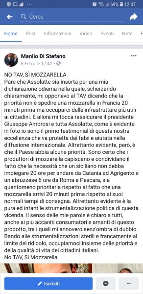 Sulla questione TAV il sottosegretario agli Esteri si è espresso attraverso i social con un post in cui dichiara di apprezzare la Mozzarella ma banalizza la questione logistica di un prodotto e di tutti i prodotti freschi che vedono nella francia il loro primo mercato di esportazione.