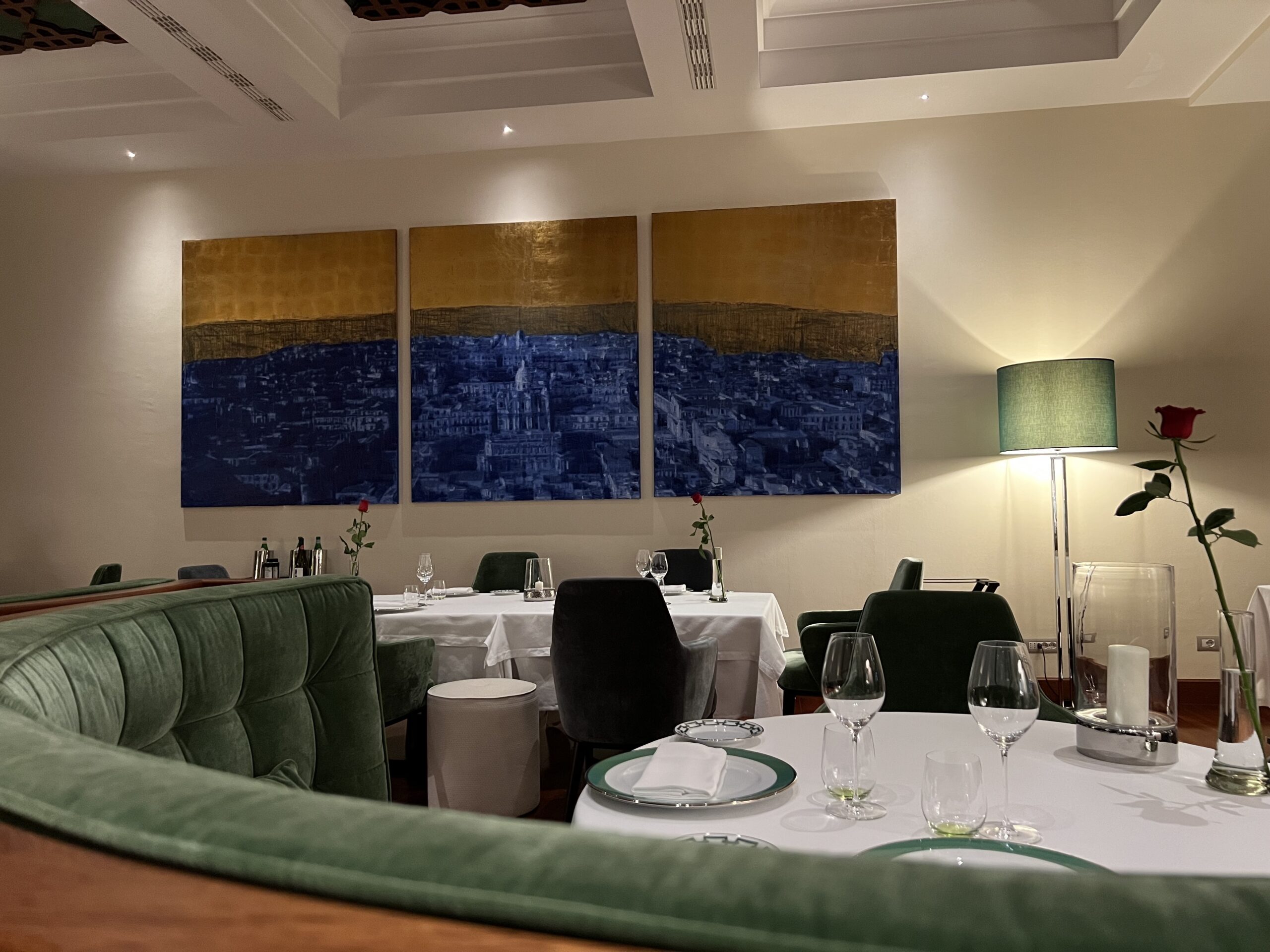 Dentro questa cornice prende forma il Principe di Belludia, il ristorante fine dining del complesso. Non un semplice complemento all’hotel, ma una vera destinazione gastronomica. L’ambiente è intimo, curato nei dettagli: tessuti morbidi, luci calde e vetrate che allungano lo sguardo verso il verde. Sedersi qui significa già entrare in una dimensione sospesa, lontana dalla quotidianità.