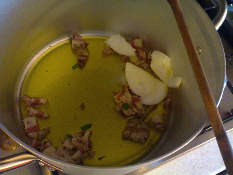 Preparare il fondo con olio, lardo, strutto e cubettini di pancetta.