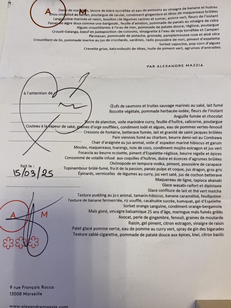 Così, il laboratorio del maestro cuciniere Alexandre Mazzia si colloca ai vertici delle esperienze gastronomiche di tutti i tempi, sapendo coniugare l’imbattibile precisione della grande cucina francese con l’estro ispanico di sponda basca, nonché con una capacità narrativa di rara maestria che sfocia nell’onirico.