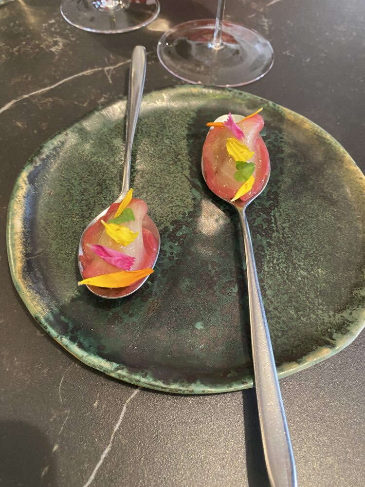 Così, nella sequenza preliminare d’ingresso, citeremo soltanto qualche suggestione, a far capire l’ingegno che incontra l’ispirazione: cavolo cristallizzato allo zafferano, bottarga di caviale, zenzero e teste di sgombro bollite; gamberoni marinati, uva passa, brodo di radici, sommacco, pepe verde, fiori di stagione; parmigiano, pistacchio, pompelmo, aloe vera; gamberetti grigi, katsuobushi delle sue teste, olio di peperoncino verde, soluzione agrumata delle loro viscere.