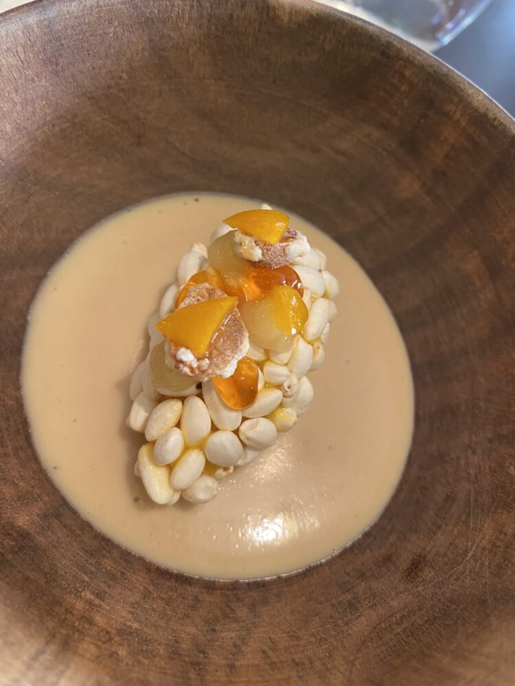 Cannolicchi al vapore di sakè, grani d’orzo soffiati, condimento iodato e alghe, succo di mela verde al finocchio; cozze, sgombro, aringa, noce di cocco, condimento al mojito e estragone; consommè di volatili e ostrica, estrazione di scorze d’arancia; topinambur fumè, frutto della passione, pastinaca, frutto del dragone, lumache grige; sgombro e perle di tapioca aikasaki; banana fermentata, riso soffiato, anacardi, kumquat.