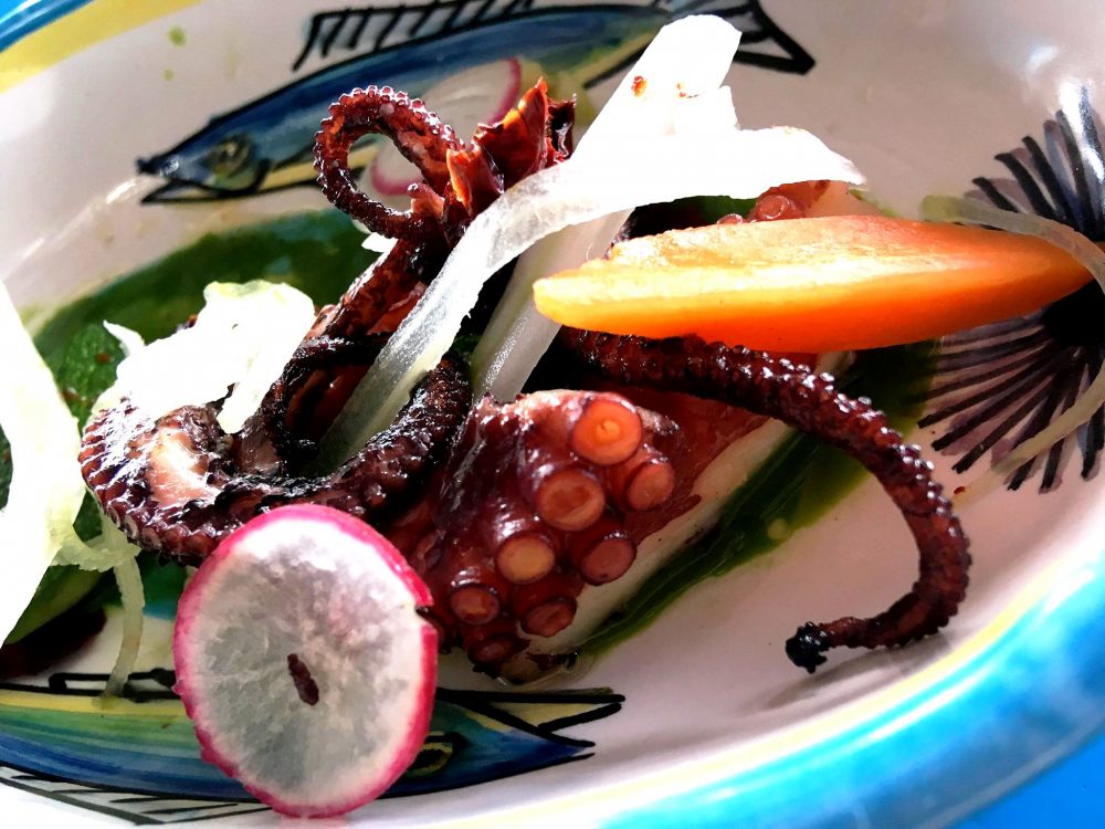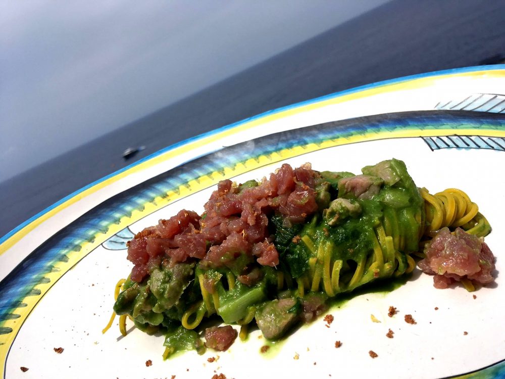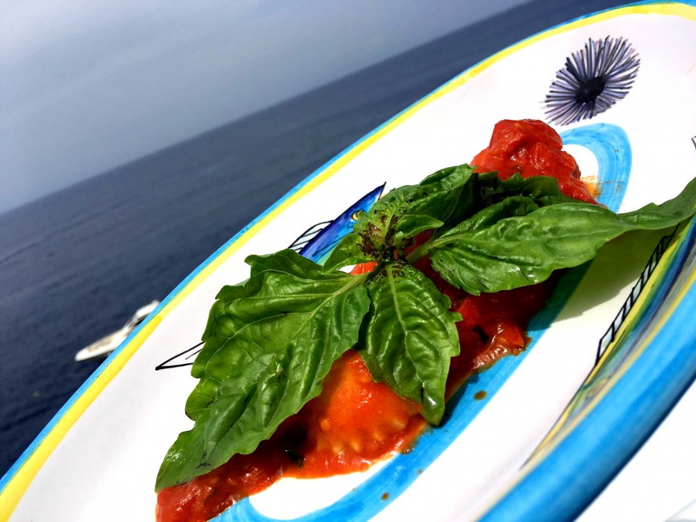 In cucina Salvatore Elefante è il resident chef, un professionista solido e d’esperienza, schivo e concentrato sul suo lavoro. La direzione è quella di Andrea Migliaccio executive del Capri Palace. In tavola piatti colorati grazie alle ceramiche artistiche con richiami marini e all’ampio uso di ortaggi di stagione. Si tratta di una cucina fresca e saporita in cui il pesce è sempre protagonista in pieno stile mediterraneo. Tanti i piatti tra cui scegliere non mancando l’antipasto con tati assaggi da dividere, nel nostro anche una triglia fritta croccante e deliziosa.