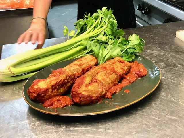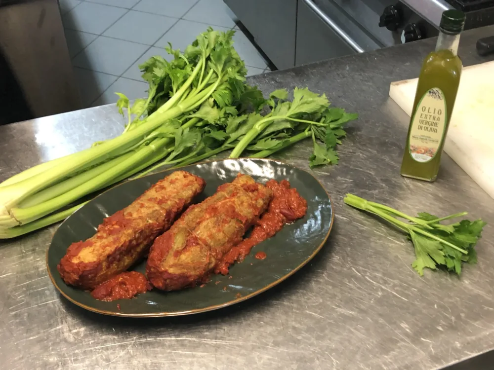 Il sedano ripieno viene poi posizionato in una teglia e ricoperto con il ragù di pomodoro e cosparso con il parmigiano grattugiato.