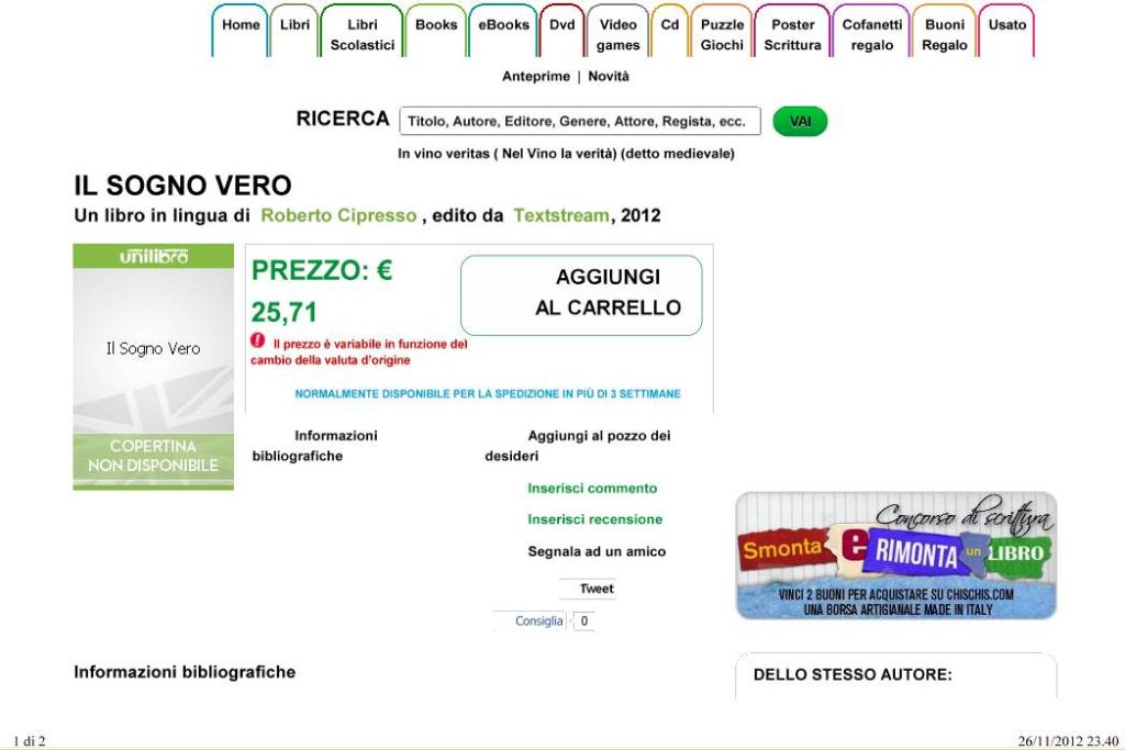 lo aprite e ci trovate dentro un libro, “Il sogno vero”, scritto da Roberto Cipresso (© 2012 by Roberto Cipresso. All rights riserved) con la copertina stranamente simile a quella de “Il Romanzo del Vino”, con solo alcune piccole varianti: la bottiglia su cui è appiccicata l’etichetta recante il titolo del libro è quella de La Fiorita, la grafica dell’etichetta è la stessa della bottiglia di Brunello appena degustata, sono spariti i nomi di due dei tre autori, Stefano Milioni e Giovanni Negri, rimane la dizione “Introduced by Robert Parker” (vi chiedete: ma almeno lui sarà stato avvisato?).