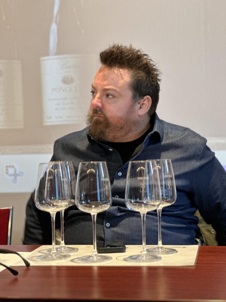 Quando arrivano i bianchi, la masterclass cambia tono. Luca Gardini li legge come fossero organismi vivi, partiture di densità, sapidità, tensione. A fianco, Gabriele Tanfani, memoria agronomica della cantina, ricostruisce annate, piogge, calore, tecniche di vigna mutate nel tempo. È un doppio registro, sensazione e storia, bicchiere e terra, che permette di comprendere ciò che rende unico il Verdicchio di Villa Bucci.