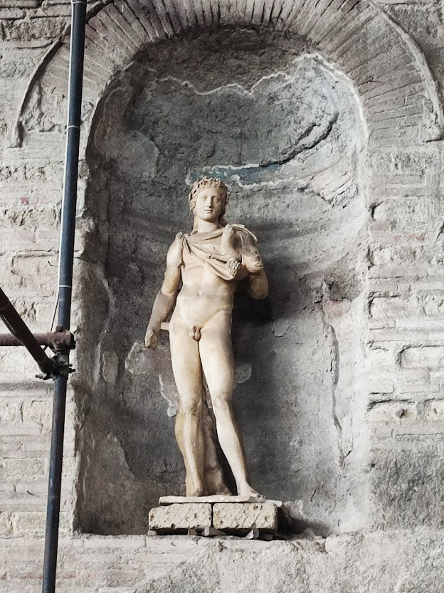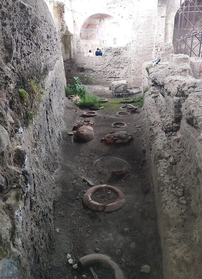 Il fatto che la villa fosse dedicata a Dioniso, il dio Bacco per i romani, insieme alle strutture affiorate dagli scavi confermano che la destinazione principale del luogo fosse la produzione del vino. Con l’impeccabile guida del professor Antonio De Simone, è stato possibile osservare la cella vinaria con un gran numero di dolia, i recipienti in terracotta dalla capienza di 10-20 ettolitri, utilizzati per la vinificazione delle uve e la conservazione del vino. La capacità degli impianti lascia presumere che la produzione vinicola non fosse destinata al solo uso domestico ma che si trattasse di una vera e propria attività commerciale.