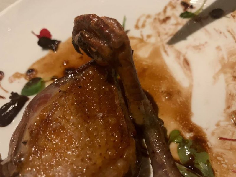 Il piccione è di scuola spagnola, con tanto di zampetta ben esibita. Grande cottura, cioccolato e tabacco hanno avuto la funzione di esaltare il sapore della carne e non l’hanno coperta. Davvero un piatto di scuola.
