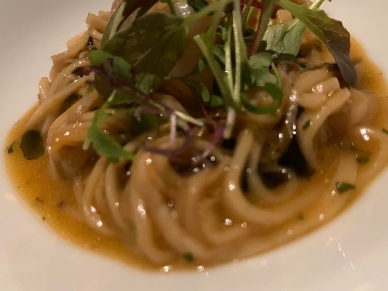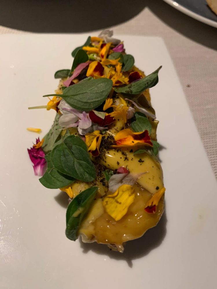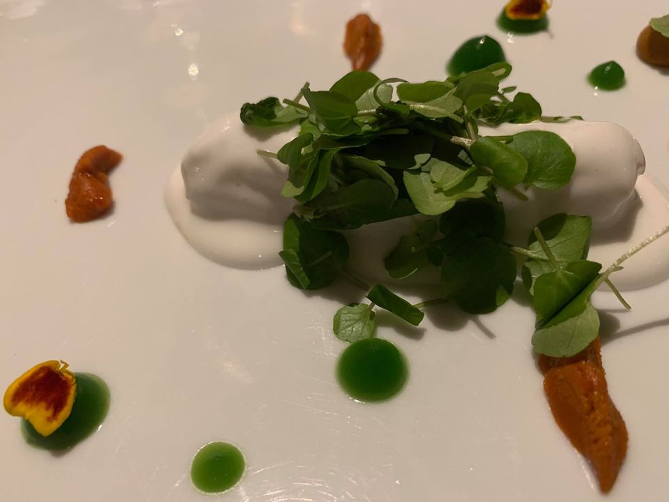 Simile l’impostazione dell’ antipasto di mare: di fatto un viaggio dall’Oriente all’Occidente, con il “finto sushi” – in realtà aria di tonno – che inaugura le danze con uno scossone umami, l’ esplosione mediterranea del mosciolo di Portonovo mollicato e panato, le tonalità più nordiche di un’ostrica fins de Claire spolverata di bernese, e di nuovo l’umami del riccio di mare che sposa la mentuccia in un connubio da lacrimuccia.