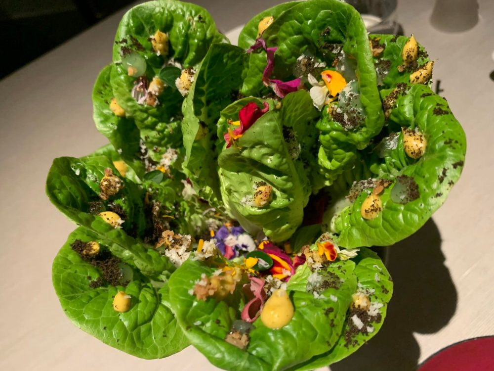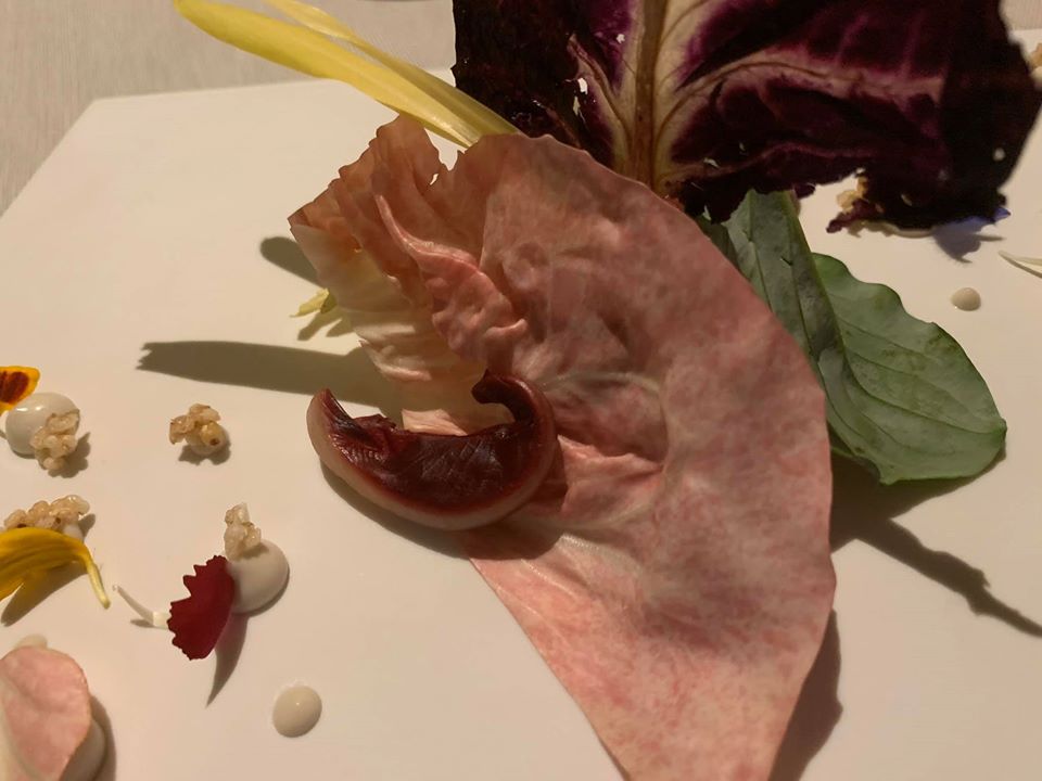 Eccoci dunque con l’insalata portata ancora viva e poi tagliata e il lievito madre. L’aperitivo deve divertire, dare qualche segnale sulla memoria (la rosetta della mortadella, la polpetta di amatriciana), anticipare qualche tema (freschezza, vegetale). Con l’influenza spagnola e giapponese questa portata ha assunto una importanza sempre più grande e per Andrea Antonini assume il significato di un vero e proprio piatto di portata, da non sottovalutare.