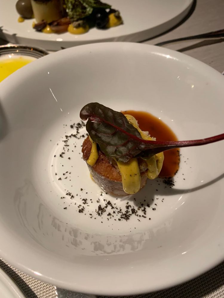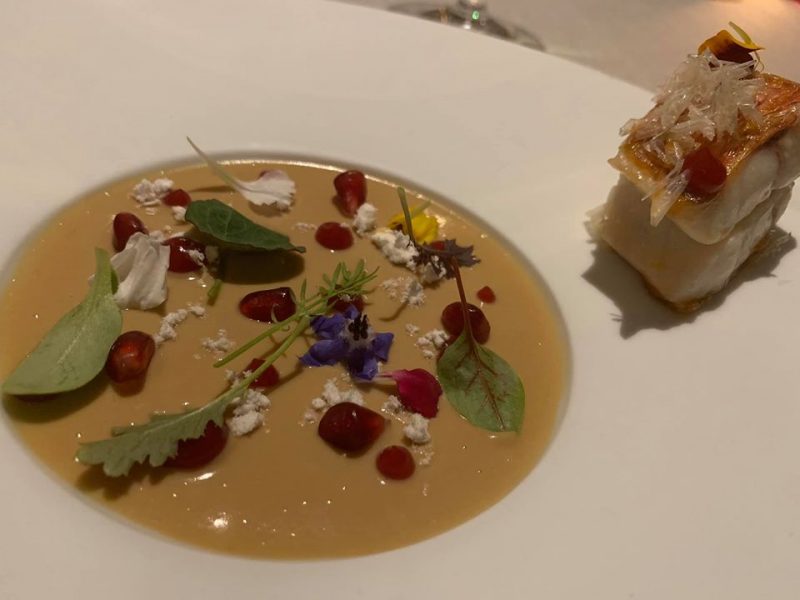 Non è la prima volta che la triglia sposa il foie gras, ma a noi questa interpretazione ci è piaciuta davvero molto anche grazie all’inserimento dell’acidità del melograno. La carne di questo pesce che un tempo si buttava si presta sempre bene alle preparazioni dell’alta cucina.