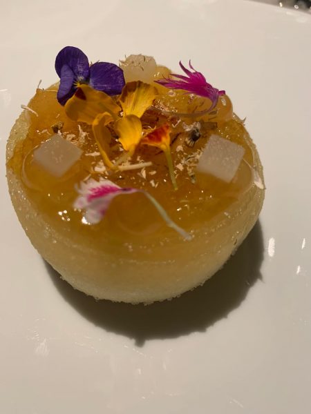 Chiusura in pompa magna con una parte dolce sostanzioso, tra pre-dessert, rivisitazione in chiave fresca e floreale di un classico “demodè” come fragole e panna (più rose), una fetta burrosa di ciambellone della nonna e un maritozzo conclusivo per non farsi mancar nulla.