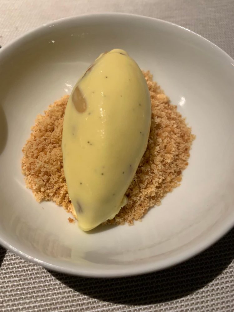 Riusciti al 75% i ravioli ripieni di granchio, pancetta, limone e mandorle: un pelino di agrume in meno avrebbe lasciato più spazio al granchio. L’astice alla catalana – chiesto in sostituzione della portata di carne – è esattamente agli antipodi: fa emergere la materia prima in tutta la sua canonica burrosità, alleggerendola con un tocco acido e vegetale.