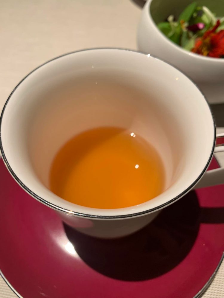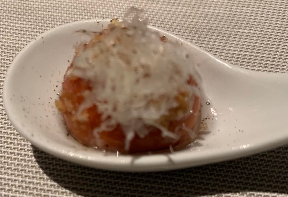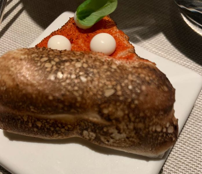 L’esperienza ha un incipit “crippiano” in tutto e per tutto: l’aperitivo – non torinese come a Piazza Duomo, ma italiano – passa per cracker alle mandorle, patatine al sapore di pollo alla diavola, finta pizza , waffer ripieno di gambero crudo, un’insalata che racchiude in pochi bocconi tutto il bagaglio di conoscenze del mondo vegetale che Antonini deve aver sviluppato nel corso del soggiorno albese, e si conclude con un romanissimo duetto di pane e mortazza e coppiette.