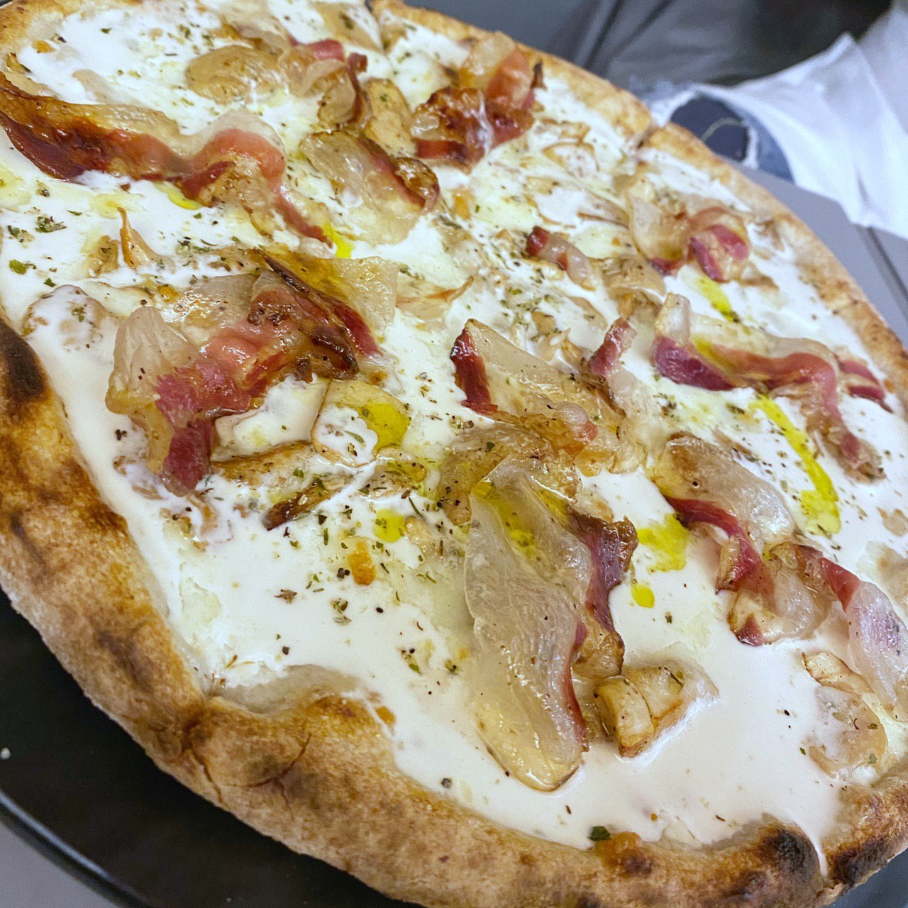 Altro bell’assaggio è la pizza al padellino cotta a vapore completata con cipolla caramellata, crudo di tonno rosso e Katsuobushi. Risultato molto gradevole, grasso e marino allo stesso tempo.
