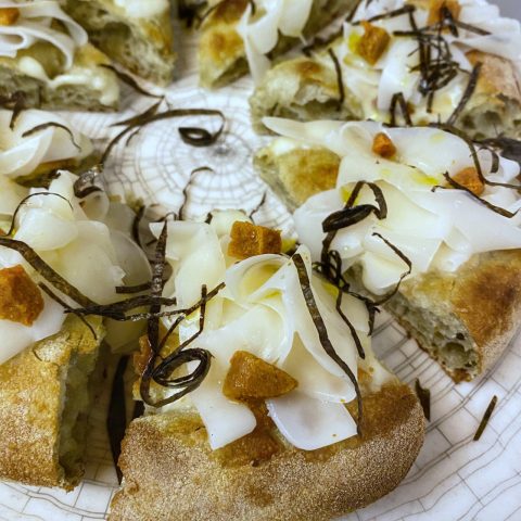 Batteria di degustazione che si chiude per noi con la pizza dedicata a Mauro Uliassi, di nuovo l’impasto al plancton, condita con un’abbondante stesa di tagliatelle di seppia (piatto icona dello chef tristellato marchigiano), granita di ricci e alga essiccata. Un mare pescoso, tra Adriatico e Ionio, con tutti i suoi profumi.