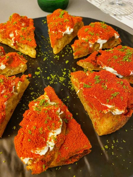 Batteria di degustazione che si chiude per noi con la pizza dedicata a Mauro Uliassi, di nuovo l’impasto al plancton, condita con un’abbondante stesa di tagliatelle di seppia (piatto icona dello chef tristellato marchigiano), granita di ricci e alga essiccata. Un mare pescoso, tra Adriatico e Ionio, con tutti i suoi profumi.
