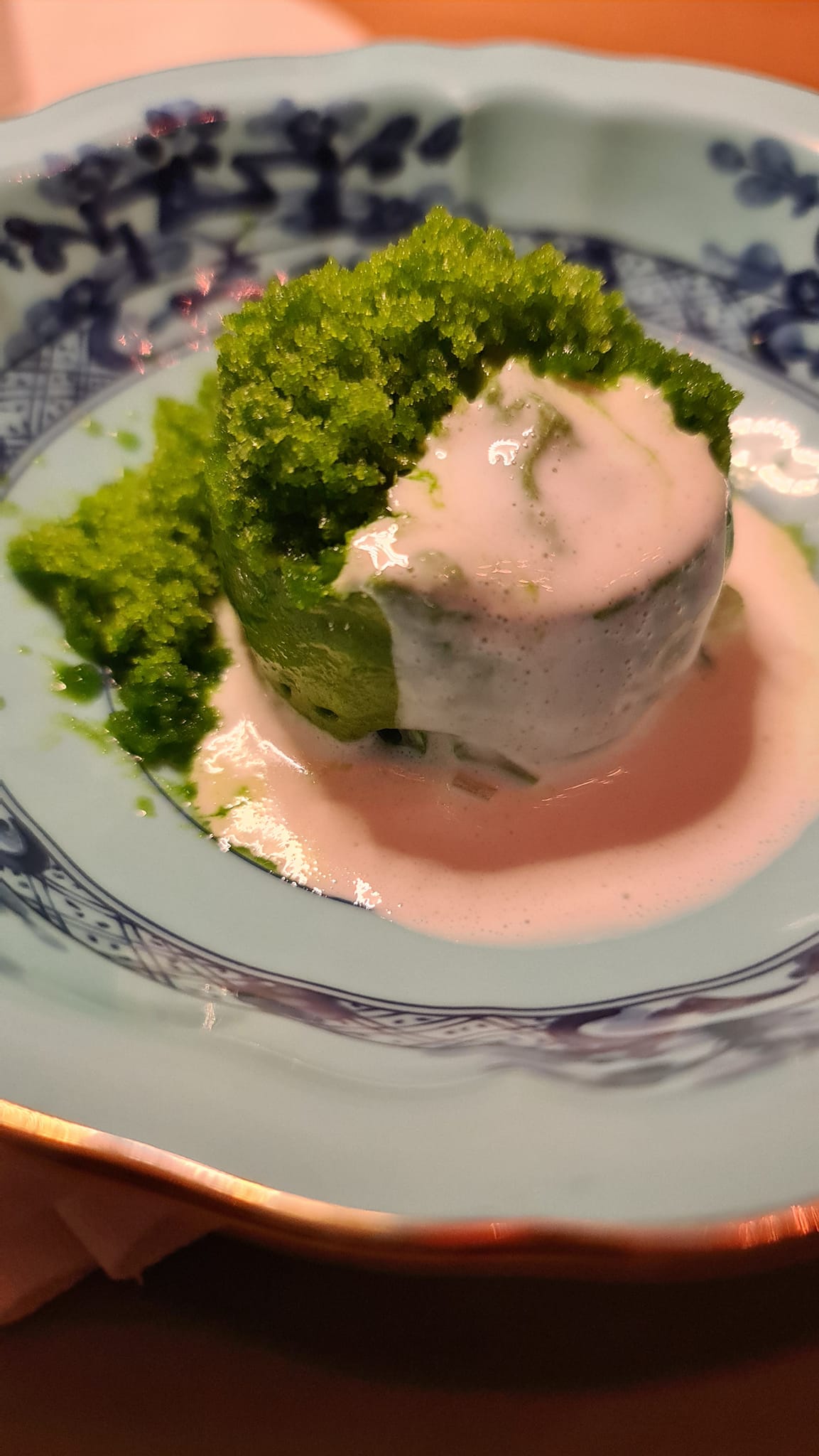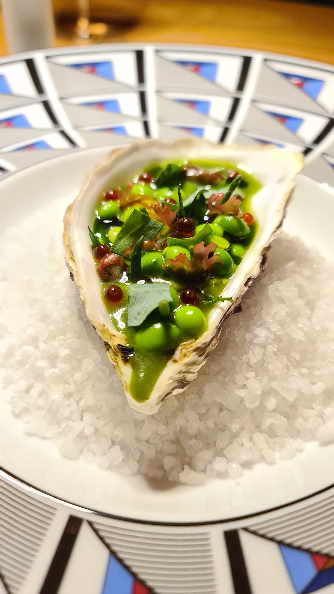 Da Milano ci spostiamo sul Delta del Po. L’insalata di mare, racchiusa in un guscio d’ostrica, diventa il pretesto per raccontare la bonifica del Palco del Delta del Po. Un gusto vegetale intenso, quasi violento. Delle vongole e delle cozze c’è solo il succo che viene usato per sbollentare fave e piselli. Un estratto di vedure all’ennesima potenza, un gusto di vegetale pulito e inebriante.