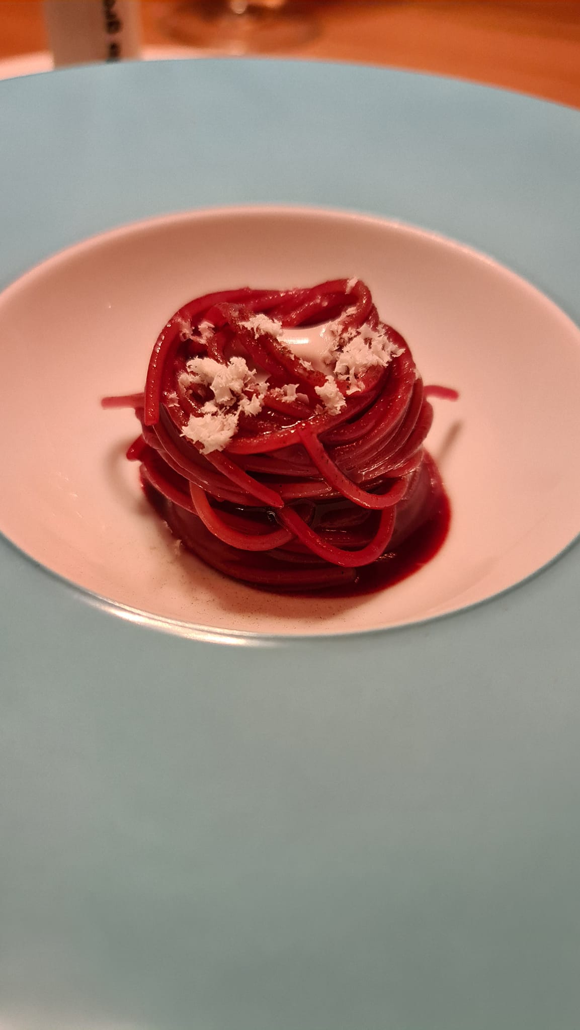 Quasi uno spaghetto al pomodoro. Un trompe-l’oeil, perchè sembra uno spaghetto al pomodoro, ma ci sono le amarene, le mandorle, i capperi. Lo spaghetto freddo è un tapis roulant per veicolare un gusto. Di una potenza gustativa soprendente, ma anche un piatto seminale, cioè un piatto che nel futuro potrebbe portare anche ad altro.