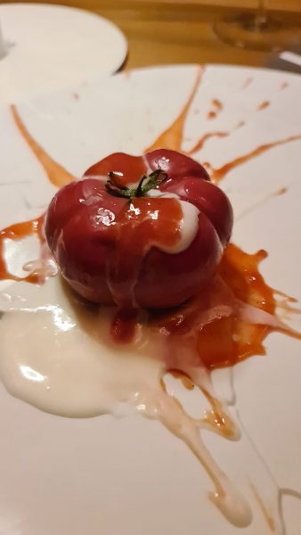 Ops! Ho dimenticato la caprese. Ho cominciato il pasto con quello che di solito me lo fa concludere, il babà, ed invece lo termino con quello che di solito lo apre, una caprese. Il pomodoro è ricostruito, un piccolo omaggio al lavoro tecnico di Cédric Grolet, ma anche il modo per concludere a Sud da dove eravamo partiti. La chiusura del cerchio e di un viaggio tutto italiano, un viaggio denso e pregno di storia e cultura. Questo pomodoro diventa anche l’analogia con l’Osteria Francescana. cerco di spiegarmi meglio. Il pomodoro arrivato dalle americhe e considerato velenoso, una pianta ai soli fini ornamentali, negli ultimi 20 anni ha conquistato tutte le grandi cucina del mondo. Non c’è un grande cuoco contemporaneo che non abbia in menu un piatto a base di pomodoro. Proprio così l’Osteria Francescana e la cucina di Massimo Bottura, che all’inizio del suo percorso veniva vista come strana, difficile, troppo concettuale, ha conquistato il mondo e continua a dettare le tendenze.