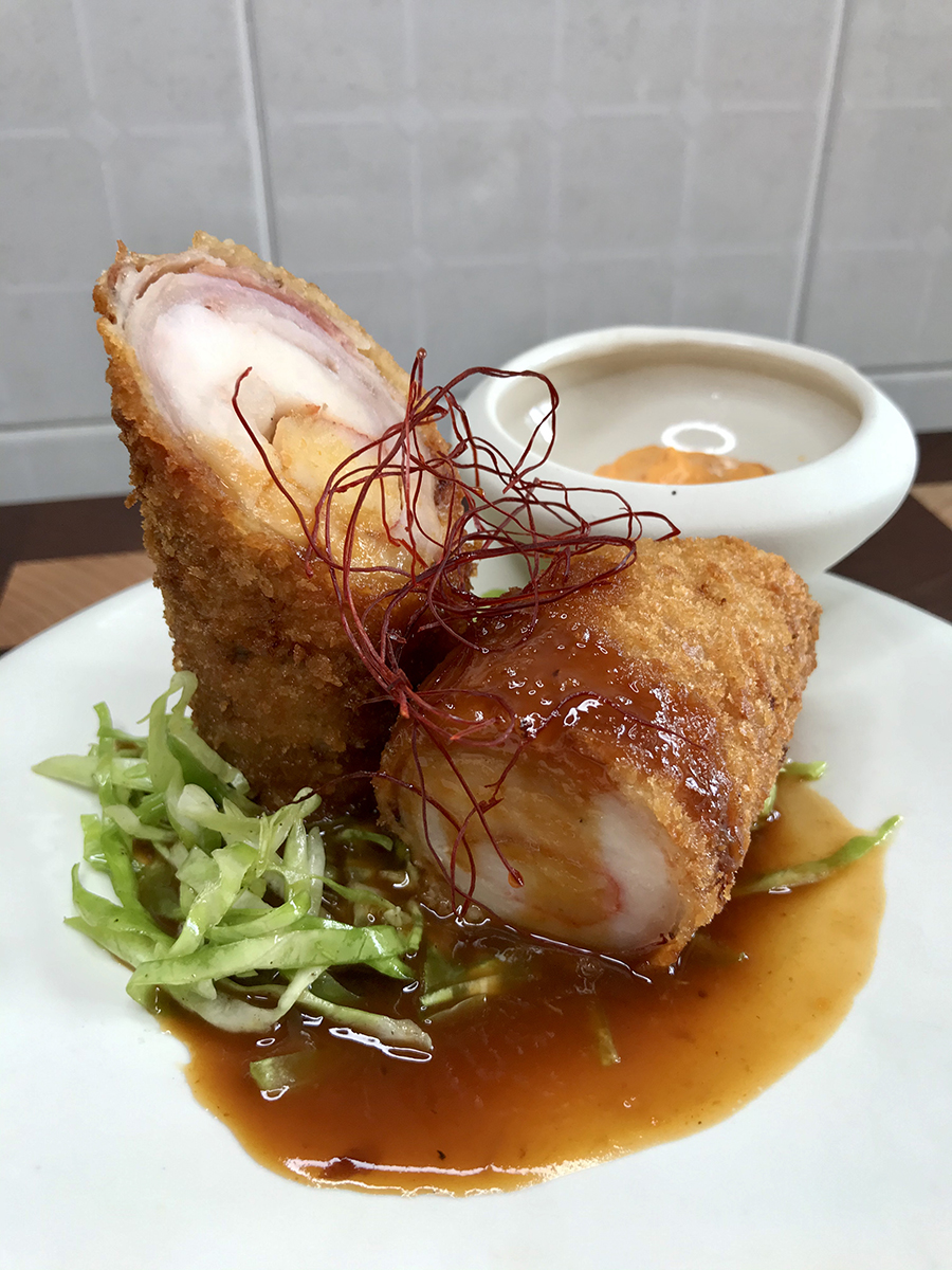 Preparare la pastella, unendo la birra e la farina, fino a quando non raggiungerà una consistenza sufficientemente liscia. Intingere il rollè nella pastella e panarlo nel panko, facendolo aderire bene. Friggere in abbondante olio a 175 °C fino al raggiungimento della doratura desiderata. Nel frattempo, tagliare finemente il cavolo cappuccio e condirlo con sale, olio extravergine di oliva e una generosa spolverata di pepe.