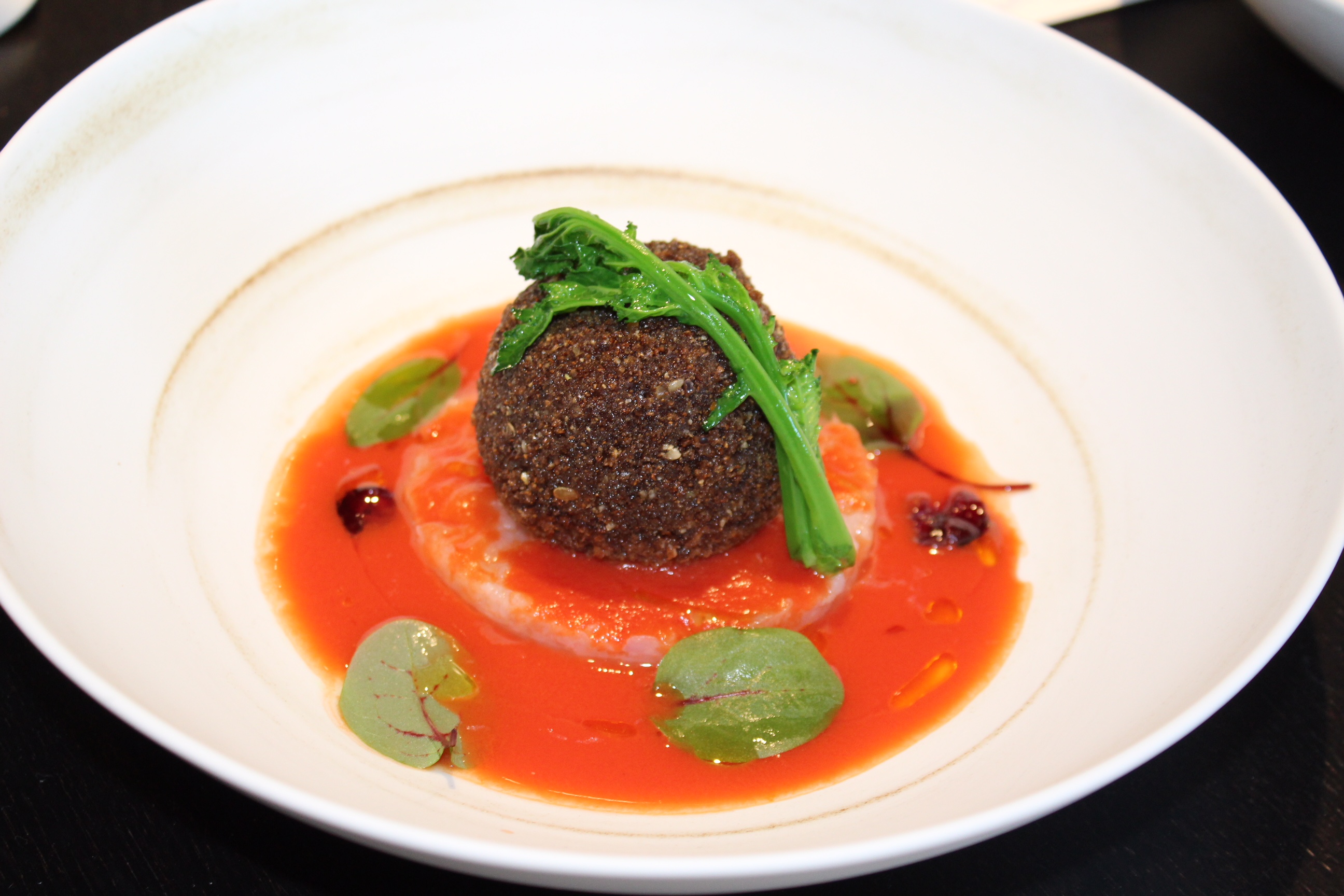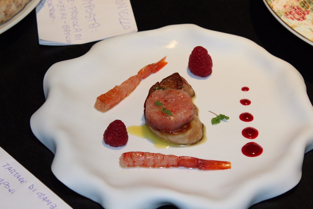 Angelo Gravino – Scaloppa di Fois Gras, tartare di gamberi rossi, salsa lamoni e lamponi