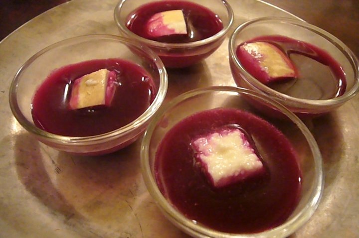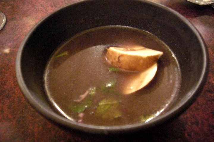 bouillon di navet, funghi, reglisse e olive, fusion orientale più freddo che tiepido e quindi perfino inutile e,
