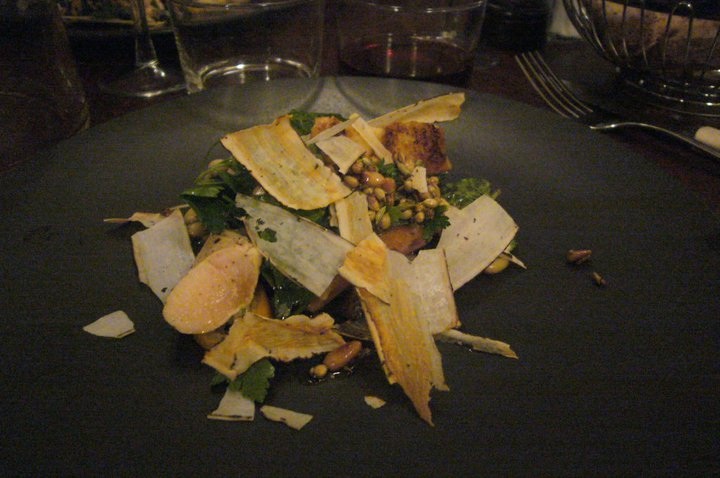 Noi, semplicemente, non siamo d’accordo. Non conta, sia chiaro, la frugalità degli arredi, che peraltro a me sono persino piaciuti, la tavola spoglia al punto che se ti metti il tovagliolino di carta sui pantaloni poi non sai più dove appoggiare le posate, non certo sul tavolo di legno pullulante di batteri. Forse in tasca potrebbe essere la soluzione migliore. I bicchieri non sono nemmeno male, se paragonati all’obbrobrio del tristellato Ambroisie dell’anno scorso. I ragazzotti sono meno spocchiosi della media parigina e perfino pazienti, dopo i trenta minuti necessari ai due competenti Pignataro/ Fiordelli per partorire lo straccio di una bottiglia di vino da quella carta piuttosto stramba. A un certo punto, brividi, si era persino pensato alla provocazione del sidro, pensate un po’.