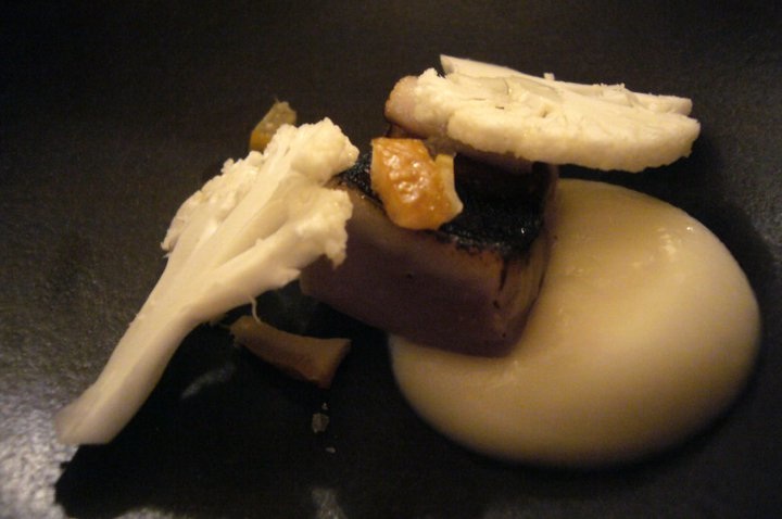l’unica cosa, UNICA, che lascia trasparire un colpo d’ala, non dico di genio: un pezzetto di maquereau, il banalissimo sgombro, deliziosamente affogato in una crema di cavolo, caffè e limone confit, dove lo scontro fra sapidità, dolcezze, amaro e acido è così centrato da apparire un caso, se guardiamo al resto del pasto.