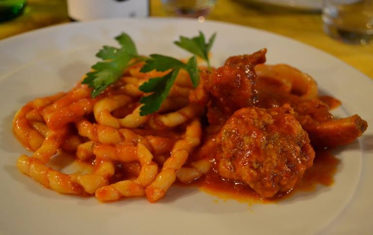 Arriva il primo, preparato come tradizione detta: fusilli fatti in casa con cotica e carne di maiale.