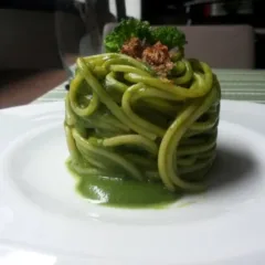 Ricette con ortaggi Spaghetti verdi ai broccoli piccanti, acciughe del Cantabrico affumicate, caciocavallo podolico e crumble di pane al pomodoro secco Caciocavallo, Spaghetti
