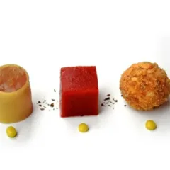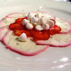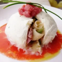 le strade della mozzarella Pasta e patate confit con tartare di gambero rosso, nuvola di mozzarella di bufala campana dop e gocce di basilico su crema di acqua di governo | Contest Le Strade della Mozzarella 12 Marzo 2014 0 commenti