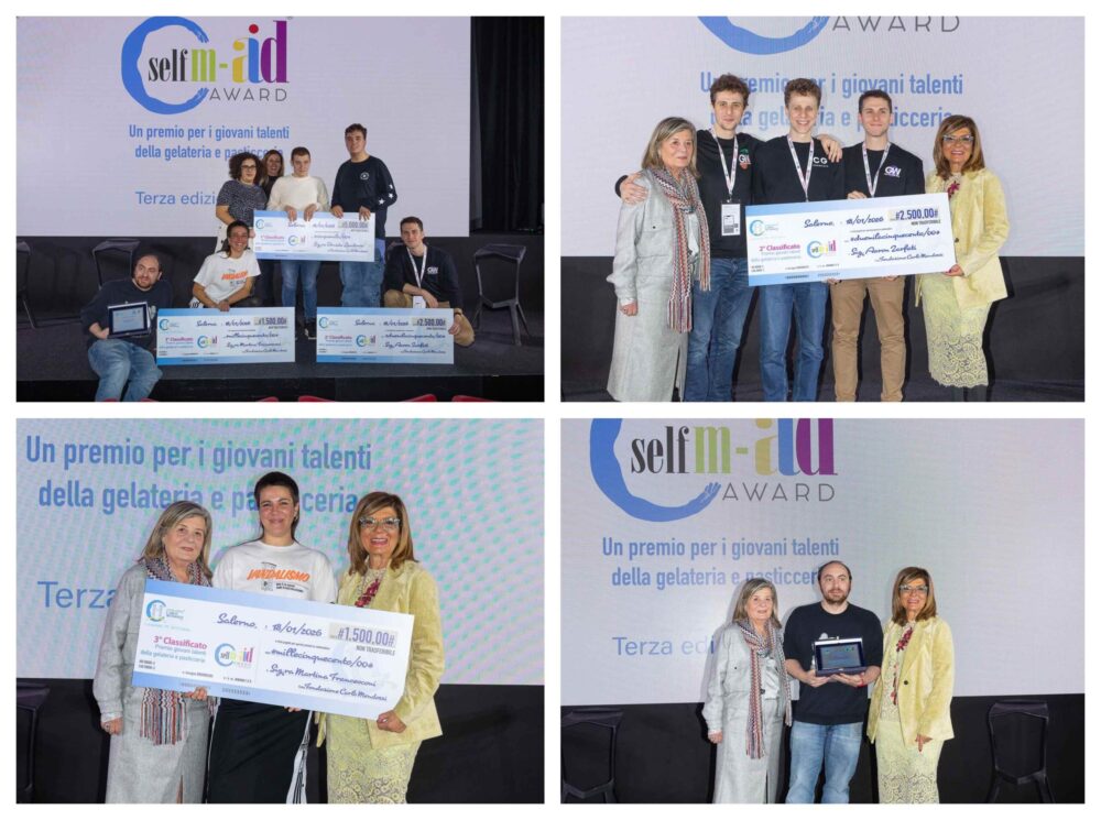 Si è svolta al SIGEP di Rimini la cerimonia di premiazione della terza edizione di Self M-Aid Award, il premio annuale promosso dalla Fondazione Carlo Mendozzi ETS di Salerno e dedicato ai giovani imprenditori del settore gelateria e pasticceria.
