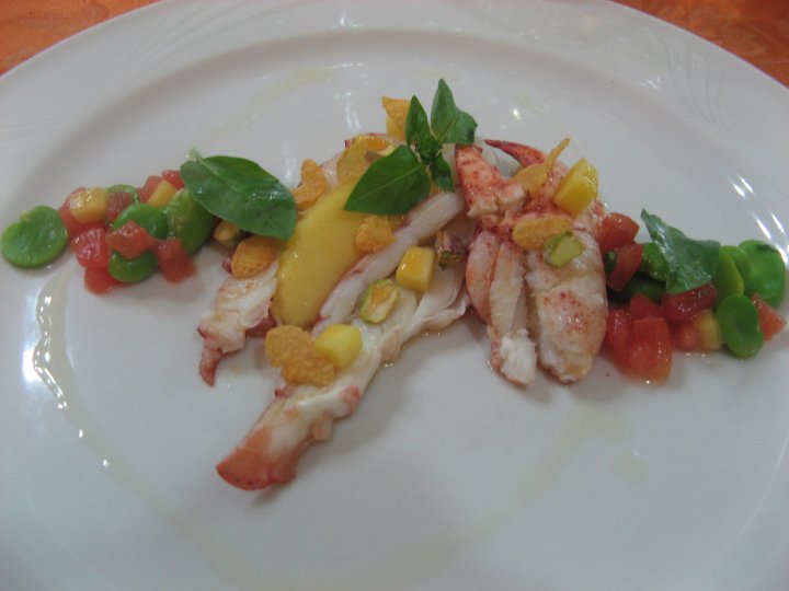 Sbollentare i carapaci 3 minuti in un court-bouillon e 4 minuti le chele. Sbollentare e sbucciare le fave, stesso procedimento per i pomodori e tagliarli a concassè. Ridurre la birra con il miele e lo zucchero fino a consistenza sciropposa. Condire fave e pomodori con la salsa di soia ,sale e pepe. Disporre nei piatti l’astice tagliato trasversalmente e nappare con la birra ridotta. Unire l’insalatina condita, i pistacchi ,i corn flakes e i fiori eduli.