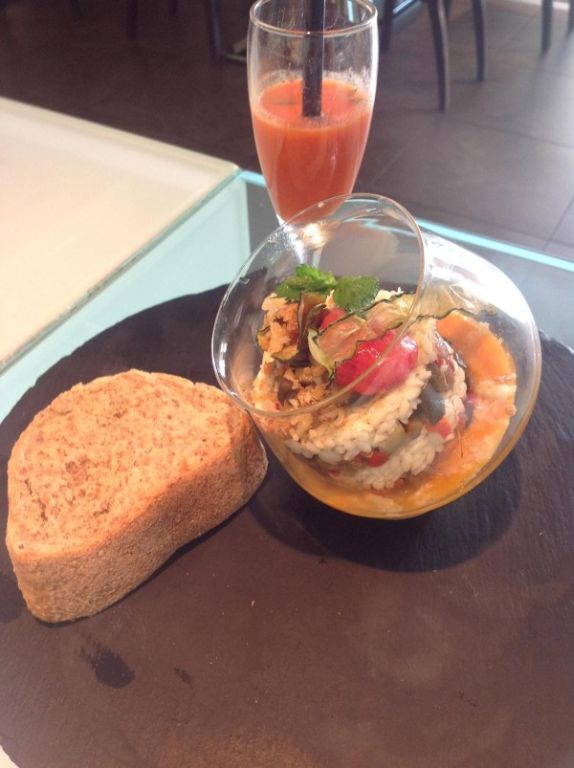 Insalata di riso da spiaggia su zucca lemon con cous cous di verdure e vascuott di granone, accompagnato da un bloody di pomodoro Sorrento e menta