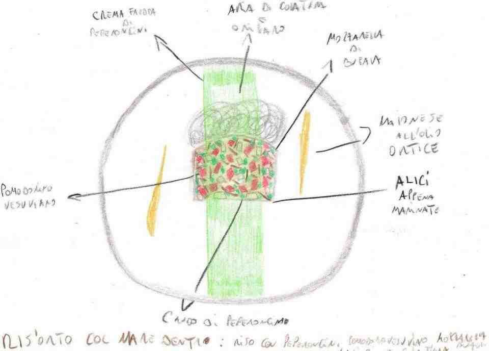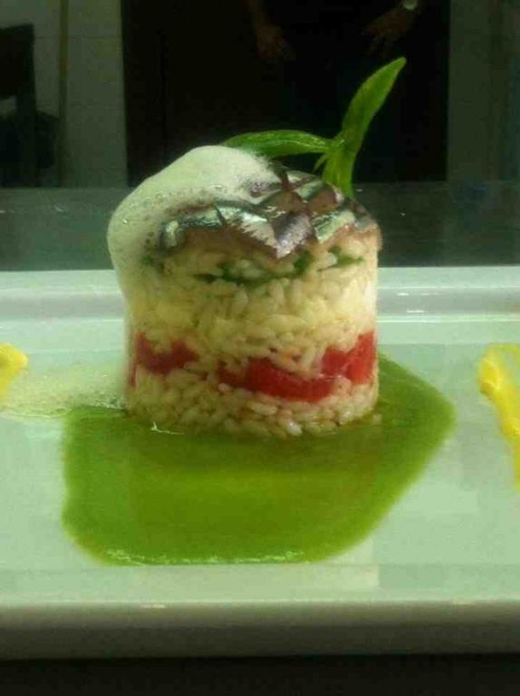 Sopra il cilindro di riso appoggiare le alici appena marinate, quindi montare l’aria di colatura con l’aiuto di un frullatore ad immersione ed adagiare sul riso e le alici un cucchiaio di aria alla colatura.