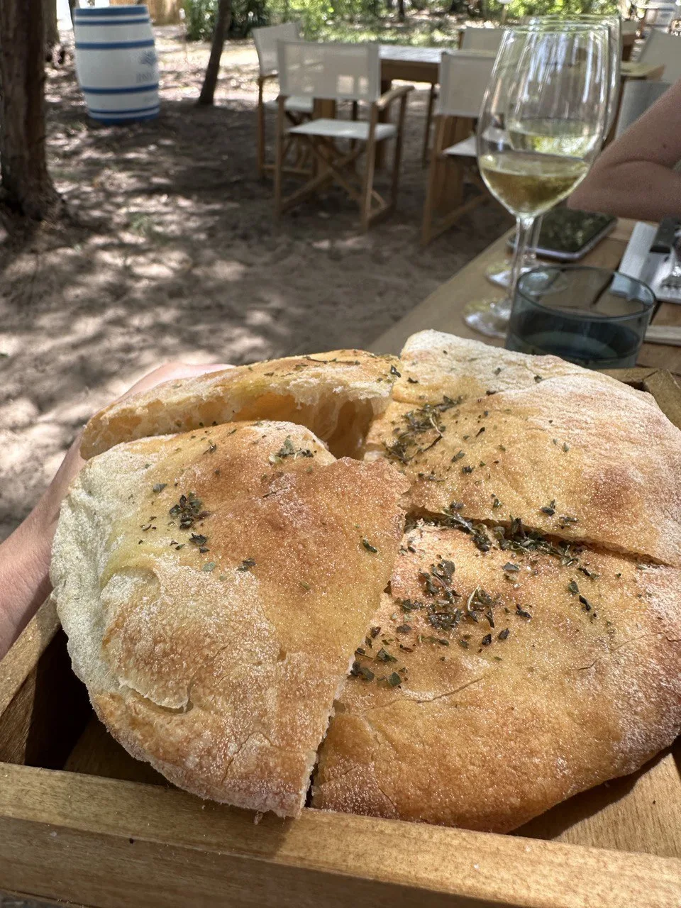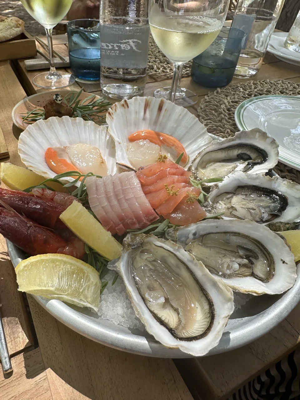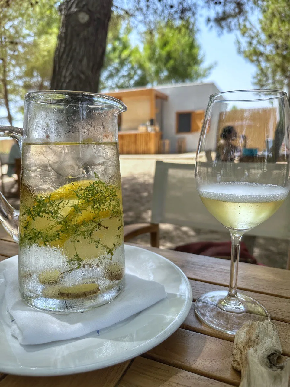 Il benvenuto è sempre con una rinfrescante caraffa di acqua con limone ed erbe aromatiche, poi ampio spazio ai vini, ovviamente Planeta ma anche Champagne e varie etichette di vini prodotti sulle isole del mediterraneo.