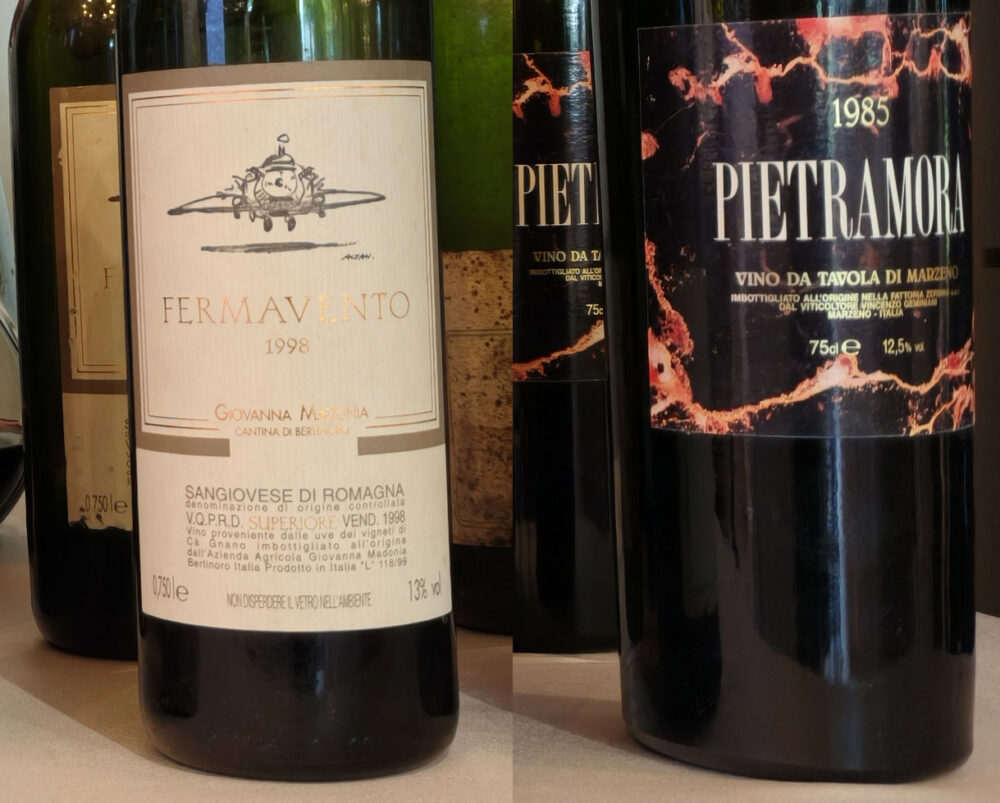 Sono due vini profondamente diversi – il primo proviene da Bertinoro e non è neanche una riserva (che si chiama Ombroso), l’altro da Marzeno, una delle sottozone più piccole del Romagna Sangiovese – ma sono anche due vini che hanno in comune una personalità straordinaria e hanno dimostrato di tenere il tempo in maniera strepitosa.