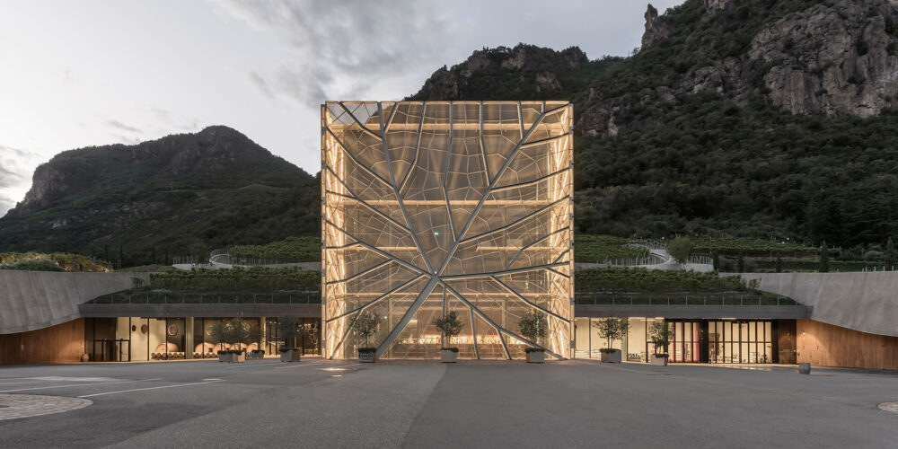 Il percorso si chiude con l’arrivo a Bolzano, dove si staglia imponente il cubo della nuova omonima Cantina di design: anche in questo caso siamo davanti ad una cooperativa, fondata nel 1908 da 30 agricoltori nel quartiere termale di Gries e che oggi è composta da 224 famiglie dedite soprattutto alla valorizzazione del Lagrein e del Santa Maddalena dal vitigno Schiava, in seguito alla fusione, nel 2001, con la coop. Santa Maddalena. La Kellerei Bozen nel 2018 si trasferisce nel quartiere di San Maurizio ed è qui che nasce il nuovo edificio a forma di cubo rilucente che sembra prendere vita dalla collina circostante e dove ogni dettaglio è stato costruito per essere al servizio della qualità del vino. Qui si trovano gli uffici, l’enoteca, il punto vendita e la zona della produzione per la maggior parte interrata. Il tutto è stato costruito nel pieno rispetto degli standard di efficienza energetica e sostenibilità Casa Clima Wine®. Una lamiera di alluminio traforato color bronzo avvolge la facciata dell’edificio, disegnando delle ramificazioni che ricordano una foglia stilizzata di vite.
