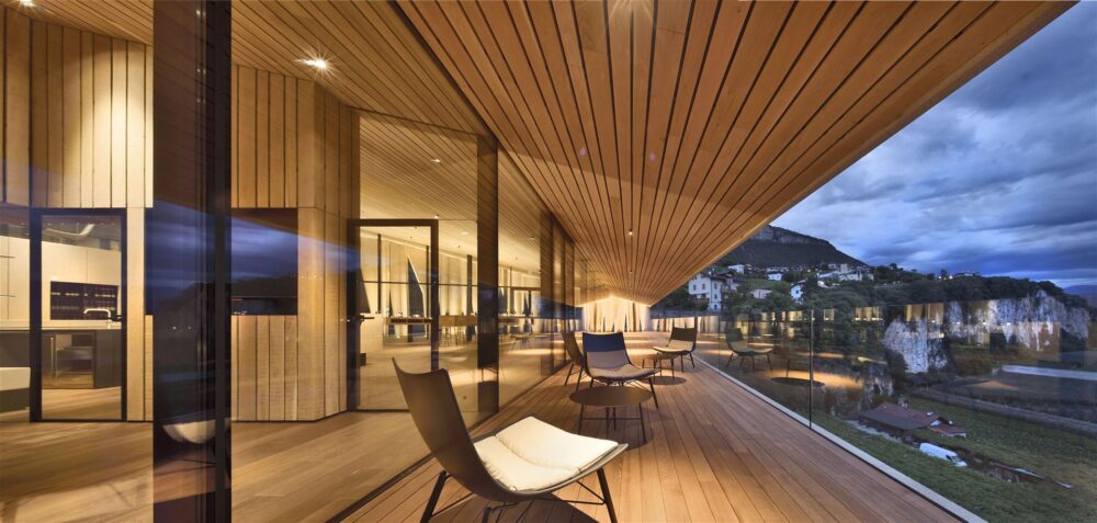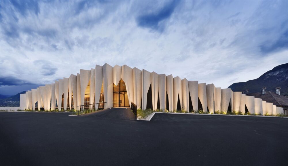 Quando si decise di realizzare un ampliamento della vecchia cantina, che necessitava di nuovi spazi per aumentare lo stoccaggio, ottimizzare la logistica e dare risalto all’enoteca, un po’ schiacciata dalla zona conferimento uve, si puntò su un investimento di circa 7 milioni e mezzo di euro per dare una vera e propria svolta alla storia aziendale: investimento fruttuoso, visti i risultati. La facciata, realizzata in calcestruzzo con dolomia, la pietra locale, dialoga perfettamente con il profilo dei monti circostanti, ai quali si ispira; all’interno, oltre al vetro, forte la presenza di dettagli in legno di rovere e decisamente interessante l’allestimento didattico del percorso di visita che, salendo o scendendo per delle scale in acciaio, accompagna il visitatore alla scoperta dei diversi terroir di provenienza delle uve.