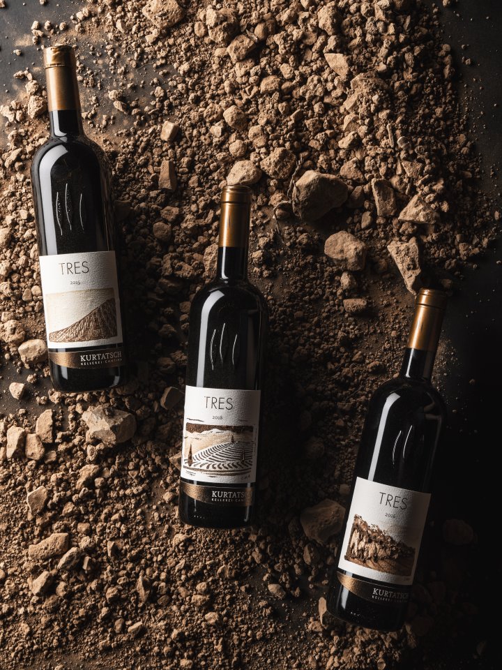 Vini che lasciano il segno: i bianchi sono ovviamente freschi ma non eccessivamente pungenti, ricchi di sentori balsamici e vegetali, quando c’è di mezzo il legno non è mai una presenza invasiva; i rossi vanno dalla più tradizionale Schiava al progetto iconico Tres che rappresenta le tre microparcelle più vecchie e migliori delle tre varietà più importanti, Merlot, Cabernet Franc e Cabernet Sauvignon, raccolte e vinificate separatamente. Non posso non menzionare le etichette del Tres: ogni bottiglia prodotta è dipinta a mano utilizzando come colore il terreno dei vigneti d’origine delle uve ed ogni edizione ha un proprio motivo, l’annata 2015 la forte pendenza dei filari di Merlot (artista Margit Pittschieler), la 2016 la parete “Milla”, la caratteristica e suggestiva parete di roccia dolomitica su cui si erge il villaggio di Kurtatsch (artista Carmen Maria Alber) e la 2018 il paesaggio di Cortaccia con i pendii ripidi coperti di vigneti, i caratteristici cipressi e la maestosa catena montuosa di roccia dolomitica (artista Carmen Maria Alber).
