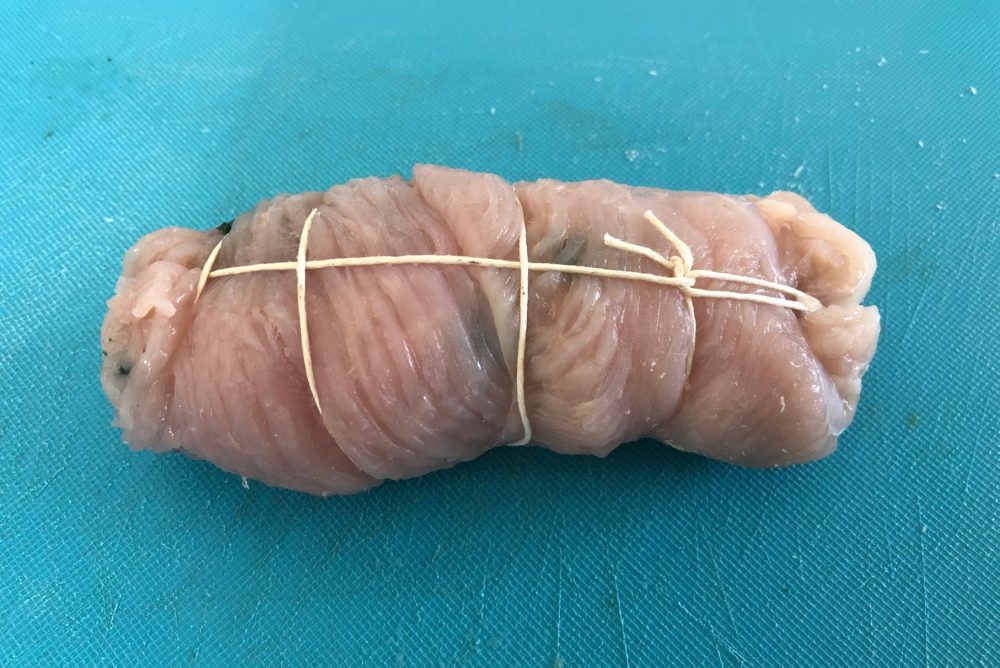 L’involtino prende forma, disporre sulle fette di tacchino il prosciutto, gli spinaci e il parmigiano (volendo è possibile aggiungere al ripieno anche un po’ di frittata sottile) poi arrotolare e legare