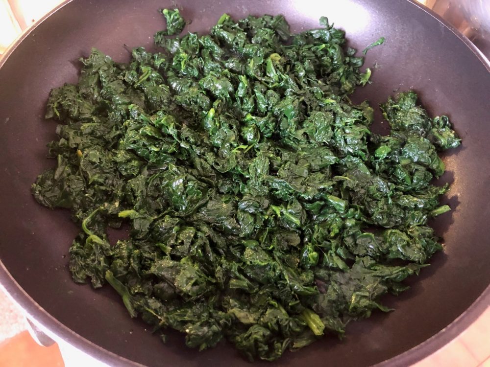 Gli spinaci in padella devono rosolare con poco olio e sale un paio di minuti, poi, una volta raffreddati, serviranno per farcire il tacchino