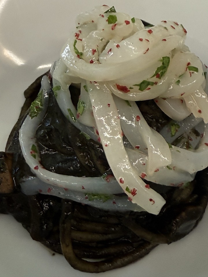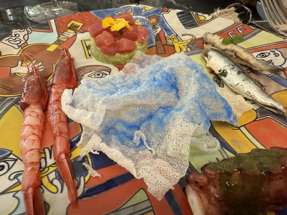 Si parte col rito del pane che il cliente spezza a mano, su cui mettere un goccio di olio di un fuoriclasse come Nicolangelo Marsicani, a cui segue un benvenuto zuccoso, d’altronde siamo nel periodo giusto di questo ortaggio. Fornelli accesi ed ecco un piatto di pesce, in cui tecnica e materia prima d’eccezione si rincorrono senza superarsi: gambero rosso da urlo, alice marinata e alice alla scapece, che buone, guacamole di tonno, bella fresca, polpo alla brace in salsa chimichurri, e una sfoglia di riso a ricordare il mare.
