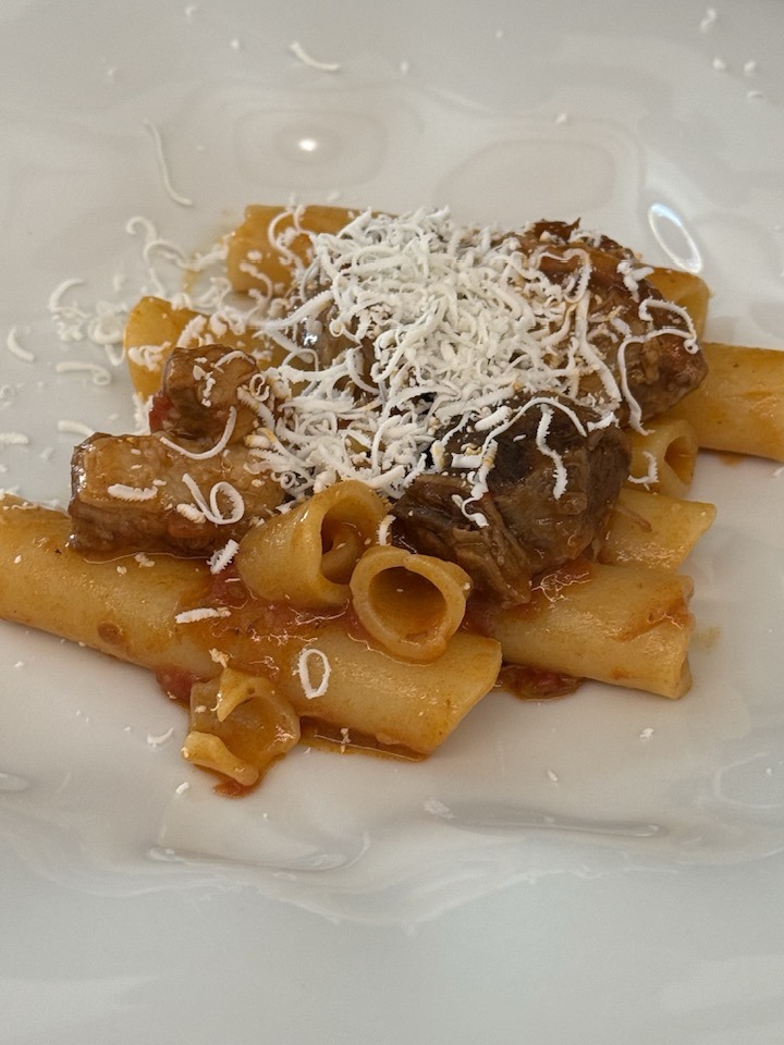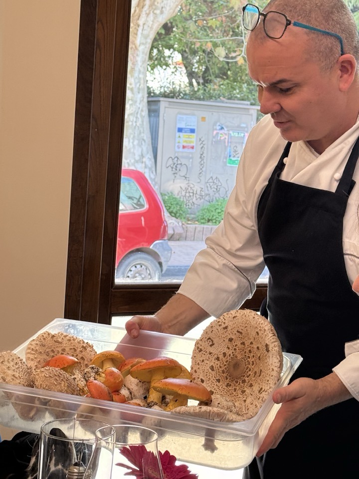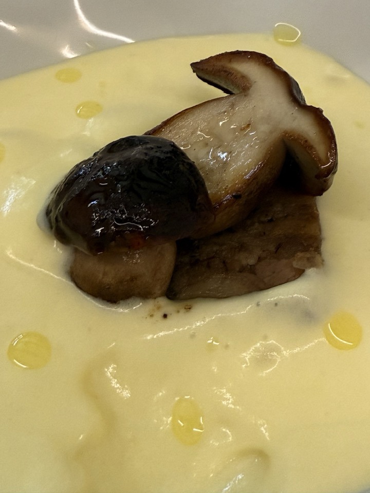 Ma il bosco è a due passi de un “fungiaro” di fiducia ha portato ovuli, mazze di tamburo e porcini e per noi questi ultimi che vanno a sposare la cicola (salume PAT riscoperto dal dottor Edoardo Grieco e gradito anche da Byron, un dolce cagnolottonostro vicino di tavola) della macelleria Finamore su una vellutata di patate, soffice più della seta. Pascal ha sapienza e cuore e lo dimostra in ogni piatto, da quello tecnicamente più complesso ai classici dellatradizione, come il tagliolino 40 tuorli al tartufo che prendono i padroni di Byron, una simpatica coppia del tavolo vicino, con cui facciamo subito amicizia.