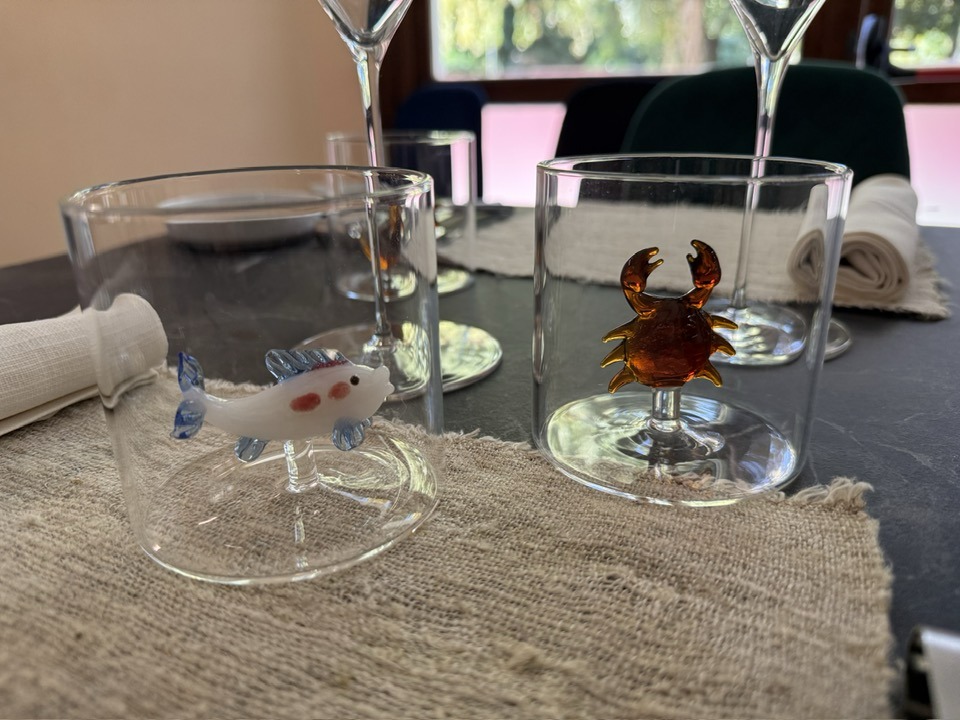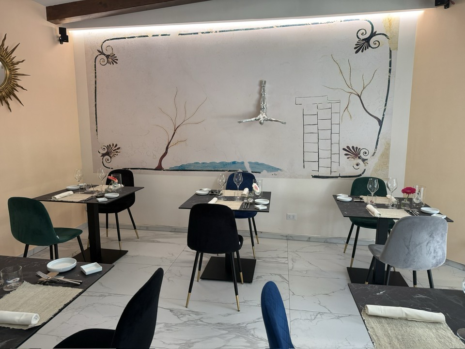 Il locale racconta l’amore per l’arte di Pascal, ad iniziare dalla parete dove è rappresentato il Tuffatore di Paestum in 3 D, passando per i menu che rimandano ad alcuni dipinti famosi, senza dimenticare le tovagliette realizzate a mano in fibra di ginestra, ed i bicchieri, vere e proprie opere d’arte di vetro.