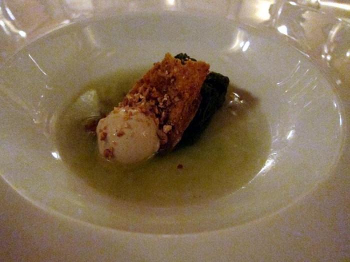 Il piatto che Gionata presenta è “Maritata di alici e noci”, un’idea che gioca su due versanti concettuali : l’aggettivo maritata, si riferisce non solo all’unione della carne (del brodo) alla verdura (broccoloni di Latina e cime di rape campane), ma anche all’unione di più preparazioni in una. Infatti anche il gioco delle temperature, tra il brodo caldo servito direttamente al tavolo, ed il gelato di alici e noci rendono bene l’idea di fondere più preparazioni contrastanti insieme. Superba è poi l’aggiunta dell’affumicato delle castagne del prete, insieme alla colatura di alici, nel condire le cime di rape.